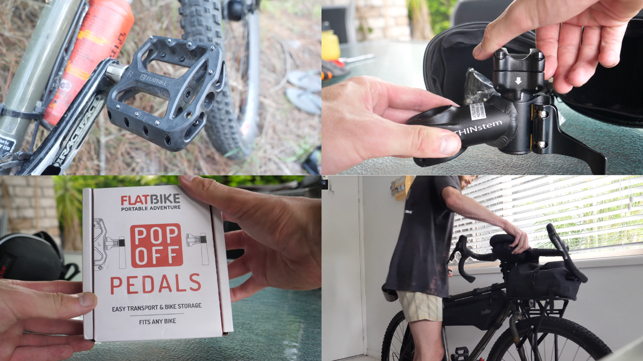 One of the most genuinely clever space-saving upgrades I’ve tested is the Flatbike Flatten Your Bike Kit, which combines their patent-pending Pop-Off Pedals with the minimalist THINstem folding stem. The pedals clip off in seconds using a dual-latch system that’s tough enough to pass ISO-4210 mountain bike destruction testing, meaning you’re not sacrificing durability for convenience, while the THINstem rotates the handlebars 90° to dramatically reduce a bike’s footprint for apartments, vans, garages, or travel. (Watch the video above to see how it works!)
